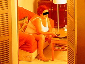 beobachten: Eine füllige Frau mittleren Alters sitzt auf dem