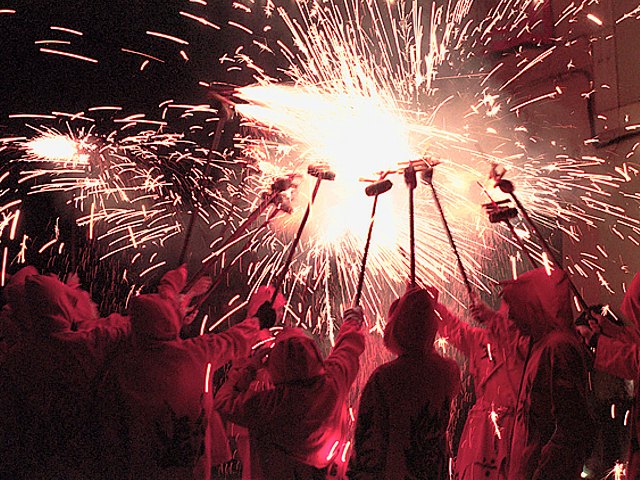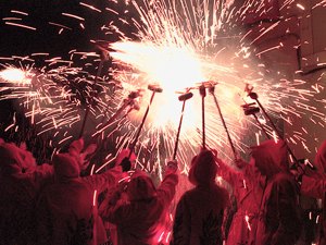 unter ohrenbeutäubendem Lärm ein Correfoc veranstaltet. Dabei laufen als Teufel