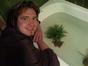 Badewanne. Sein Aquarium ist einfach zu klein geworden, jetzt müssen wir mit